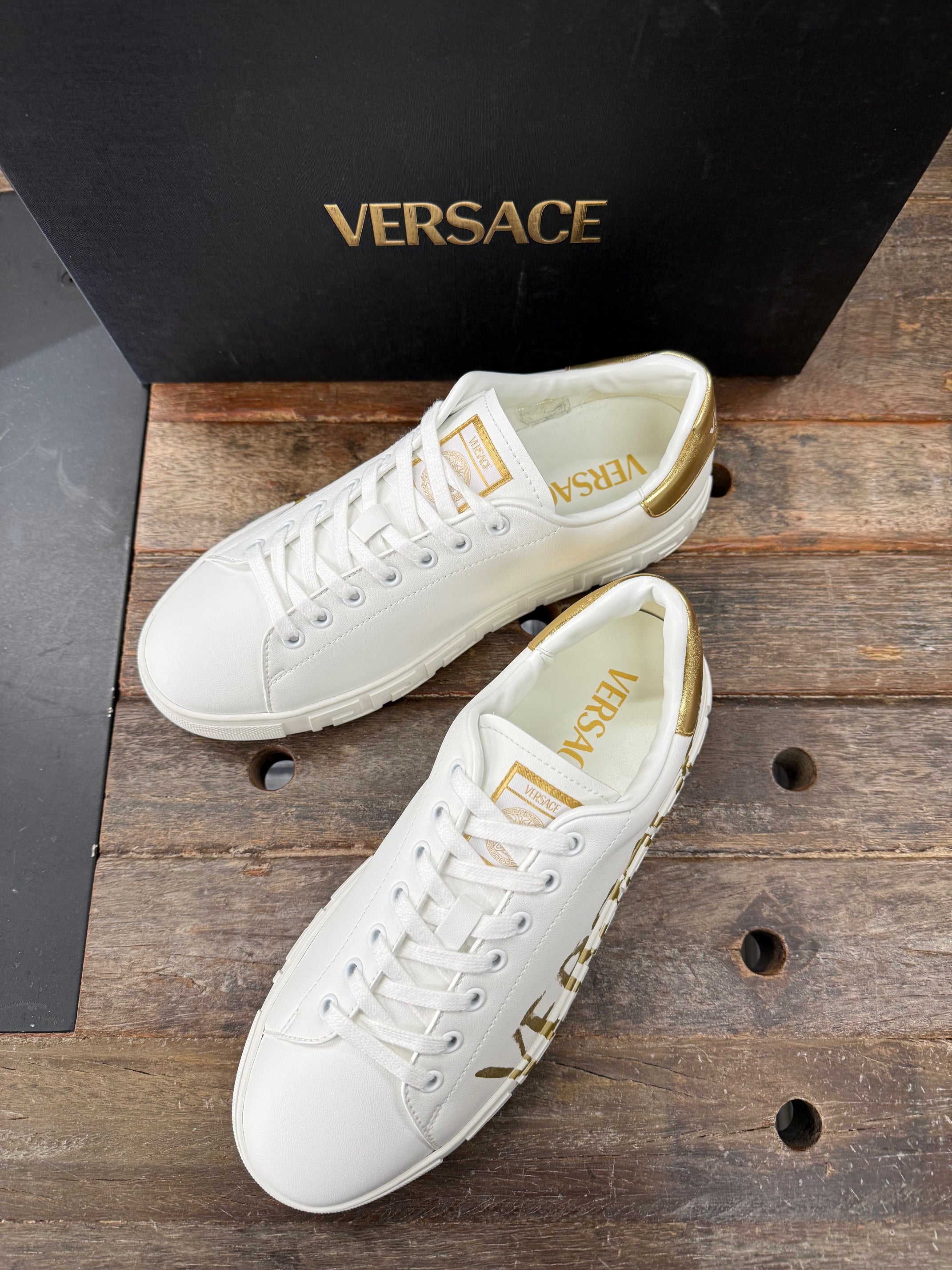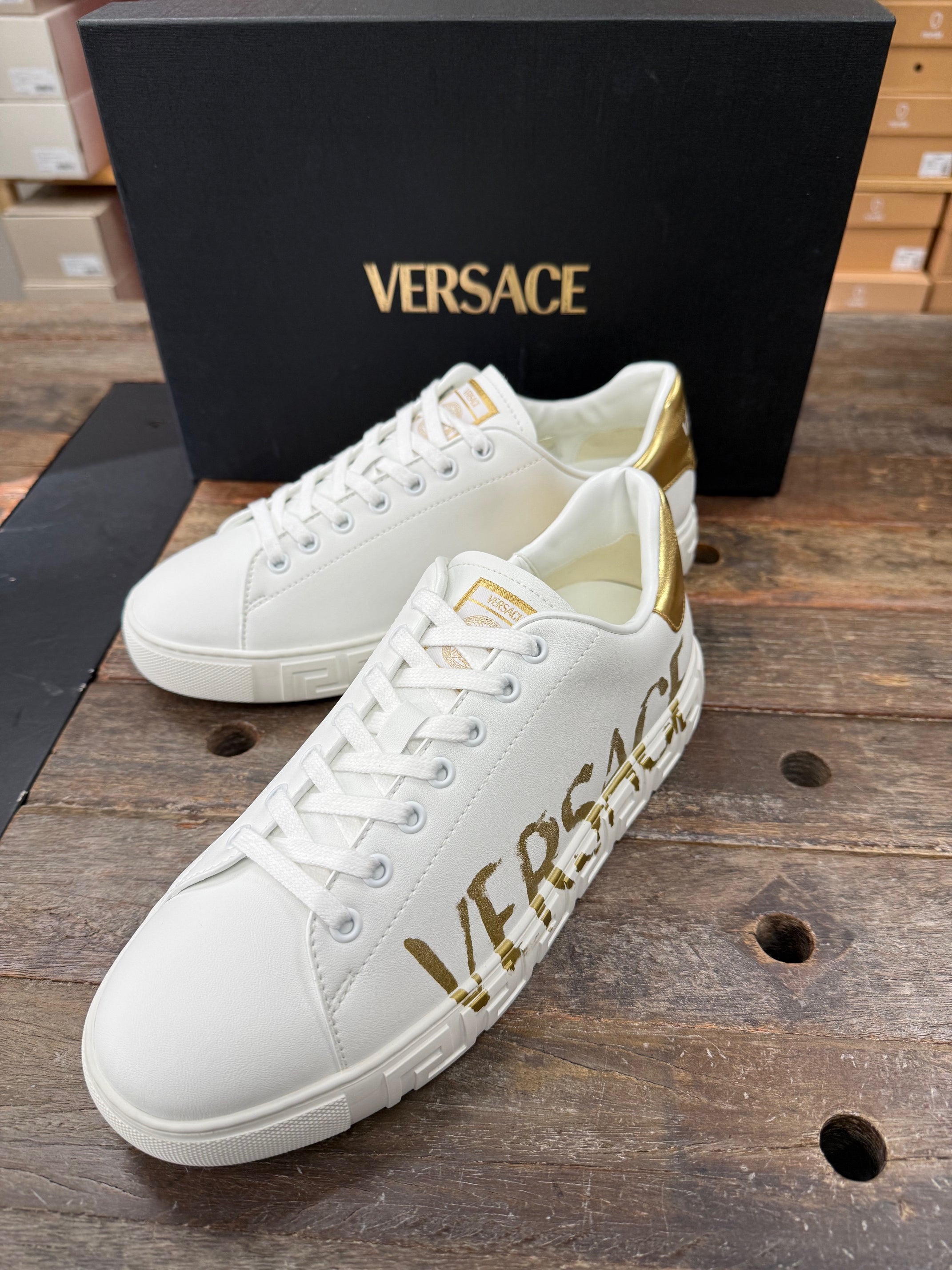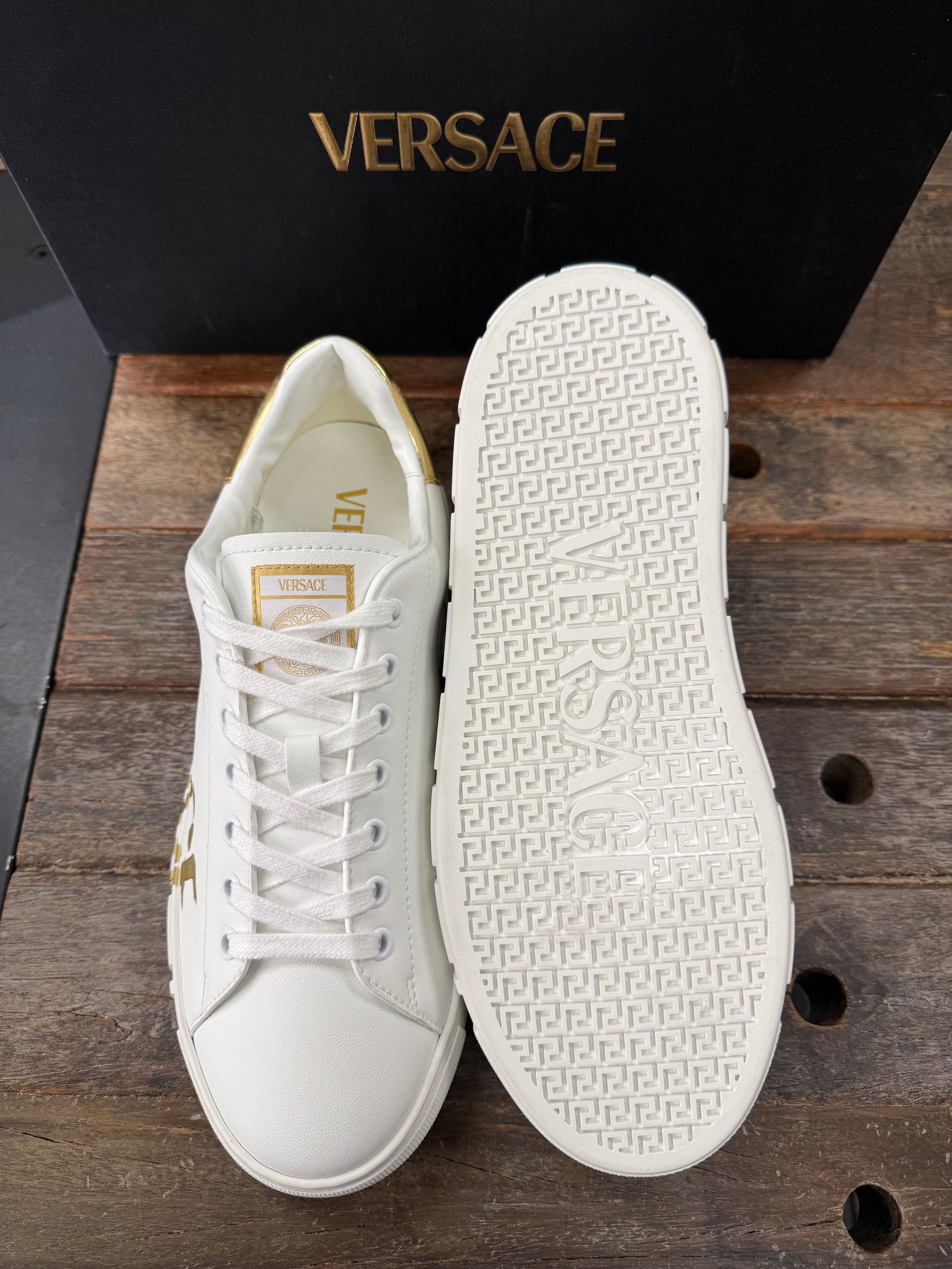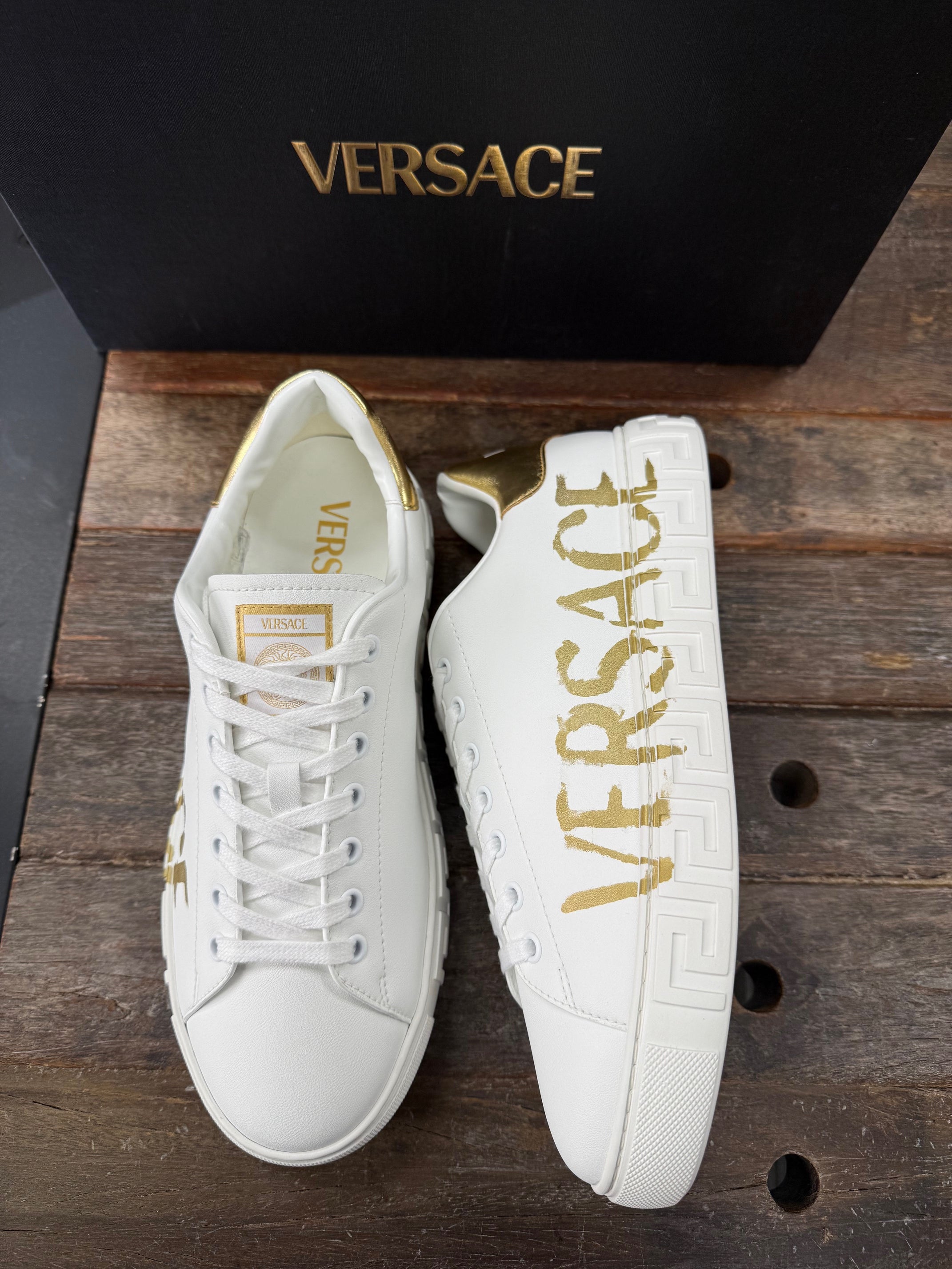 The low-top silhouette is characterized by an engraved Greca pattern on the soles and features a painted Versace Script Logo on the uppers. A Versace Logo stamp on the back accents the style. Greca sneakers are made using responsible materials with certified recycled content and/or are derived from renewable origin.